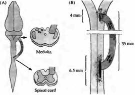 Рис. 2. Мостики между продолговатым и спинным мозгом дают возможность нейронам ЦНС прорастать на длинные расстояния. Имплантированный мостик состоит из куска седалищного нерва взрослой крысы с деге нерированными аксонами, с сохранившимися шванновскими клетками. Этот мостик функционирует как канал, по которому могут прорастать центральные аксоны. (А) Место приложения имплантанта. (В) Нейроны метили перерезкой имплантанта и наложением HRP к перерезанным концам. Позиции 1 472 клеточных тел нейронов были помечены ретроградным транспортом HRP y семи крыс с имплантантом. Большинство клеток, посылающих аксоны в имплантант, были расположены вблизи него.